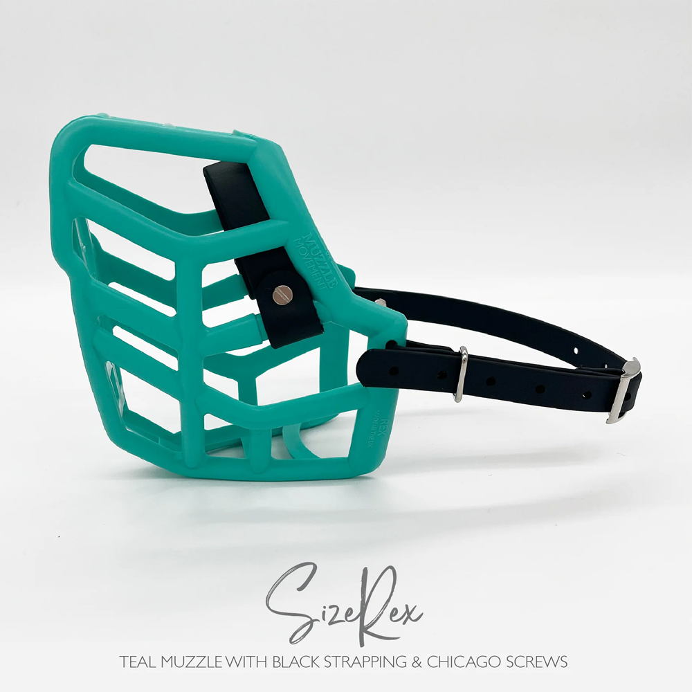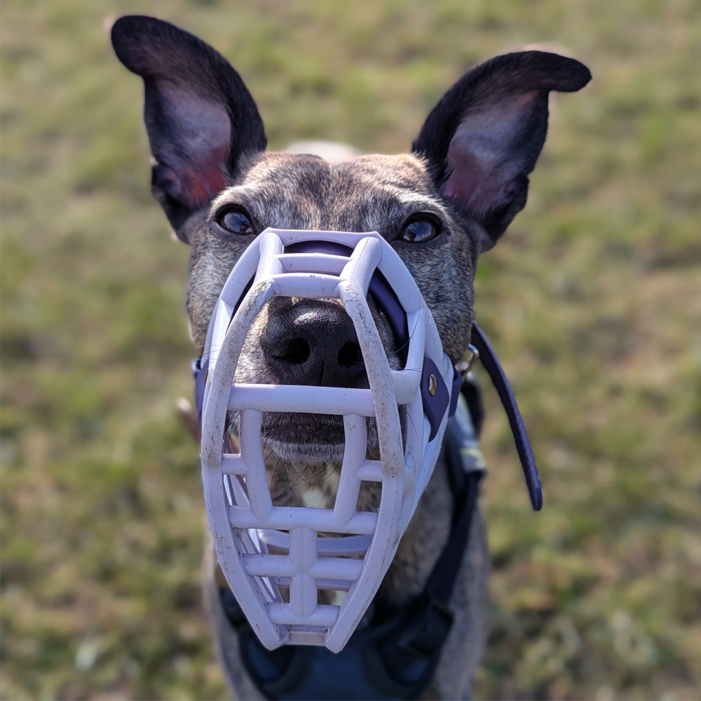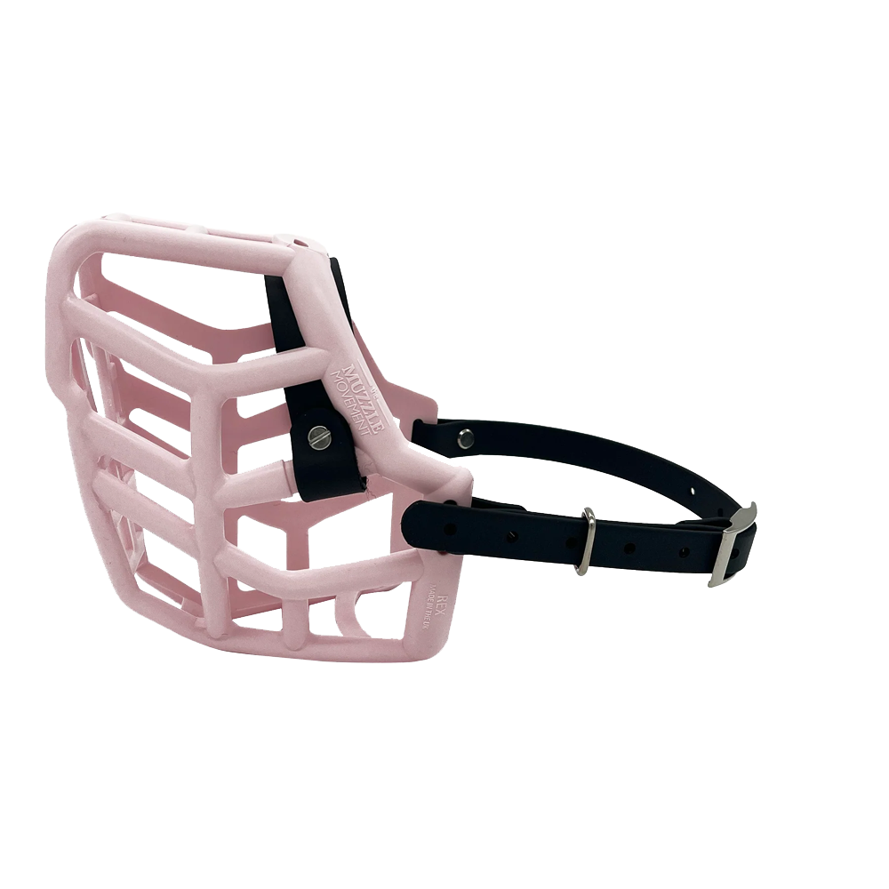 A diferença entre o açaime Rex e o Rex* é a largura da faixa nasal. O Rex* tem uma banda nasal Biothane com 38 mm de espessura que, quando combinada com o cesto Mizty, pode acrescentar algum comprimento para os cães que precisam. A parte do cesto do açaime permanece a mesma. A faixa Rex* é vendida em separado aqui.