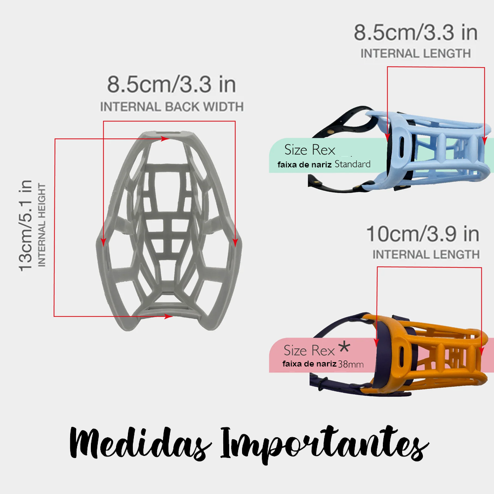 Nota2: os açaimes Rex e Rex* são o mesmo açaime, apenas diferenciando a faixa de nariz usada, no caso do Rex é a original e no caso do Rex* será a versão mais larga. O mesmo acontece para os restantes modelos de açaime.