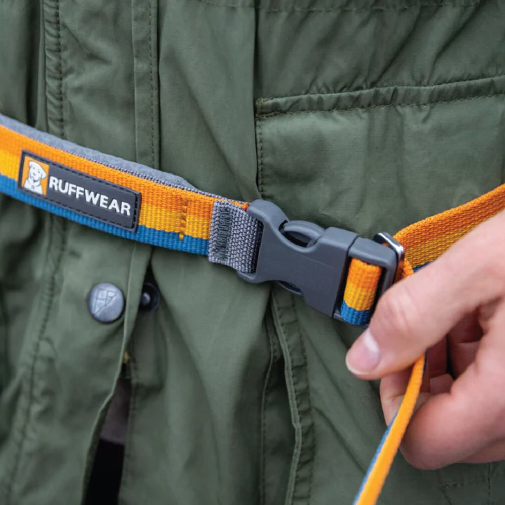 Inclui as características únicas da Ruffwear, como uma alça acolchoada, uma alça para acessórios para sacos de recolha ou pequenos acessórios de guia anexáveis, e uma fita resistente que mantém a sua cor, para que possa ser a sua guia favorita durante muitos anos. A cintura ajusta-se até 122 cm.