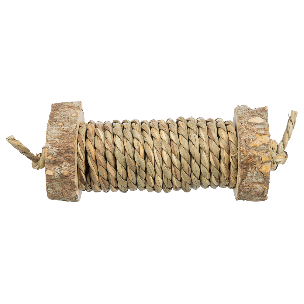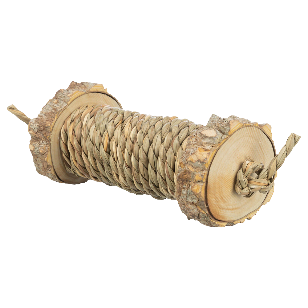 • Objeto cilíndrico de corda natural com extremidades de madeira com casca