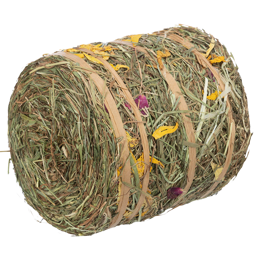 Bloco de feno com flores para coelhos e pequenos roedores. O feno além de ser nutritivo, é essencial para ajudar na atividade intestinal, pois é rico em fibras, e para o desgaste natural dos dentes dos roedores, que estão em constante crescimento.