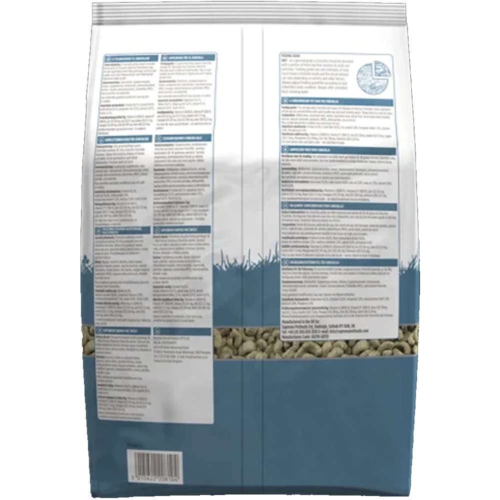 A chinchila adulta média necessitará de 30-40g/dia de Chinchila Selectiva. Devem também ser fornecidos legumes frescos juntamente com feno de boa qualidade e água potável. Guarde em local fresco e seco.