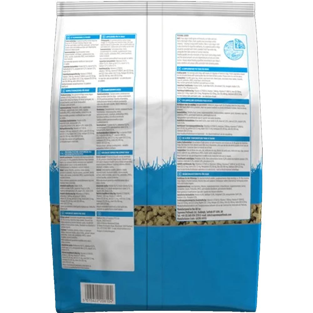 Feno de erva Timothy, trigo, casca de soja, ervilhas em flocos, farinha de soja, cevada, linhaça, óleo de soja, prebióticos (MOS), manjericão seco, brócolos secos. Pode conter soja geneticamente modificada e vestígios de frutos de casca rija.