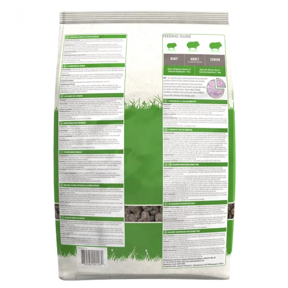 Um porquinho-da-índia adulto médio necessitará de 40 a 50 g/dia de Selective Guinea Pig Botanicals. Devem também ser fornecidos vegetais frescos, juntamente com feno de boa qualidade e água potável limpa. Armazene em local fresco e seco.