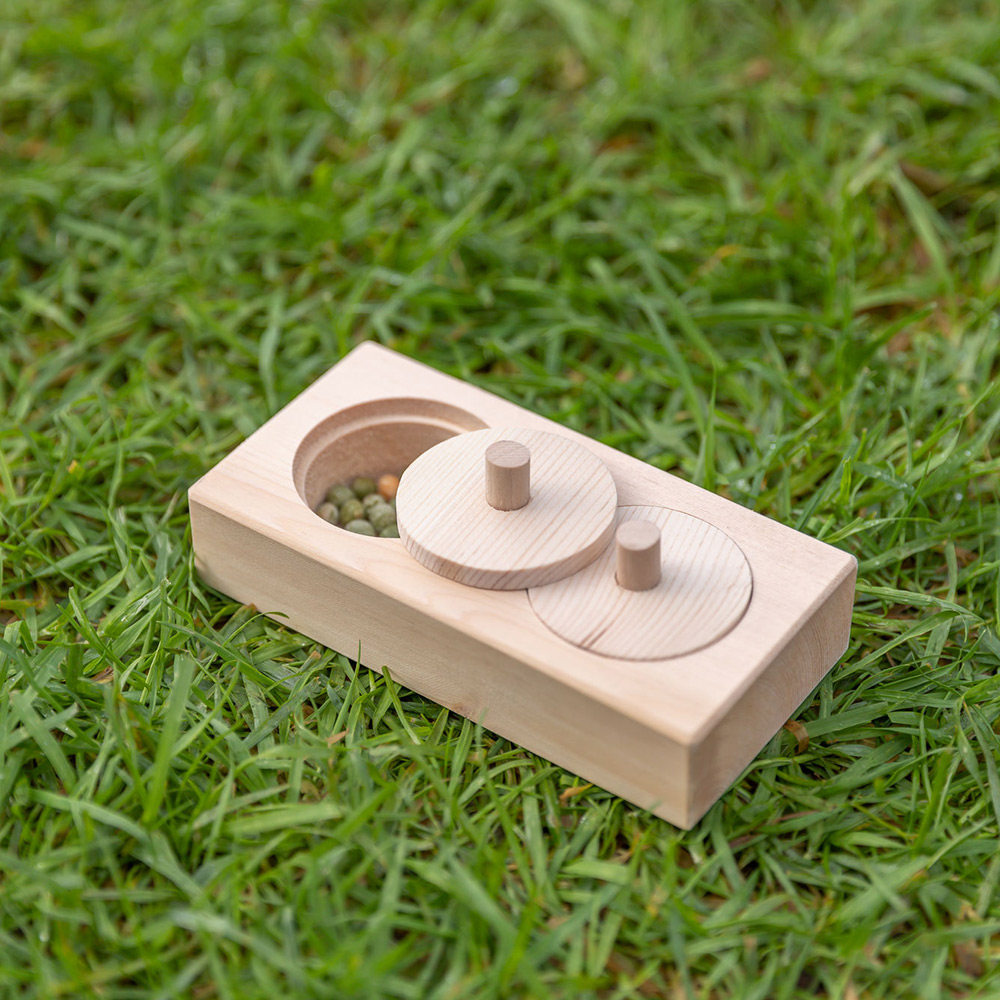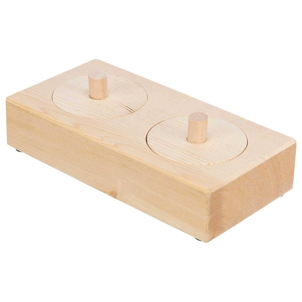 Caixa de madeira clara com duas tampas redondas e puxadores cilíndricos.