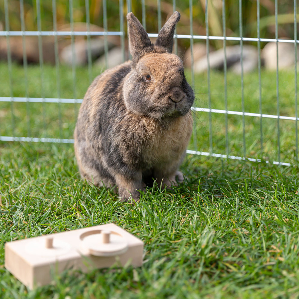 • Coelho cinzento e castanho sentado na relva dentro de um recinto com brinquedo de madeira
