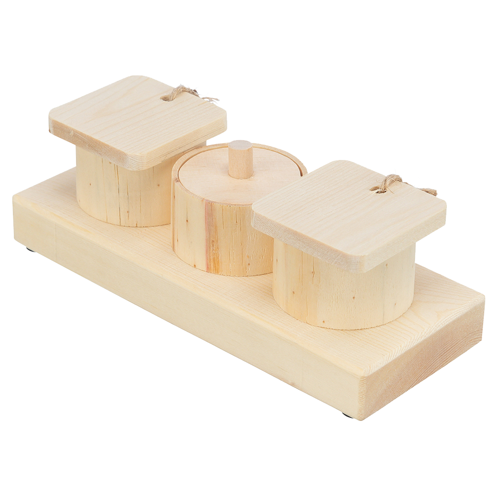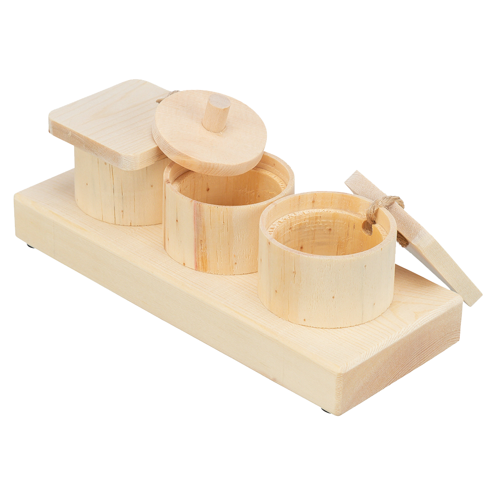 Conjunto de recipientes redondos de madeira com tampas numa base retangular de madeira
