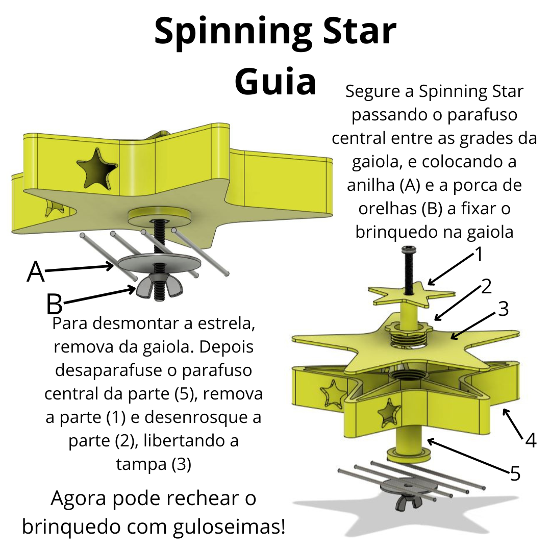 O brinquedo traz todos os parafusos e anilhas necessários para prender à gaiola. O brinquedo ocupa um espaço de cerca de 15 cm de diâmetro por 3 cm de altura, permitindo um amplo espaço para esconder snacks!