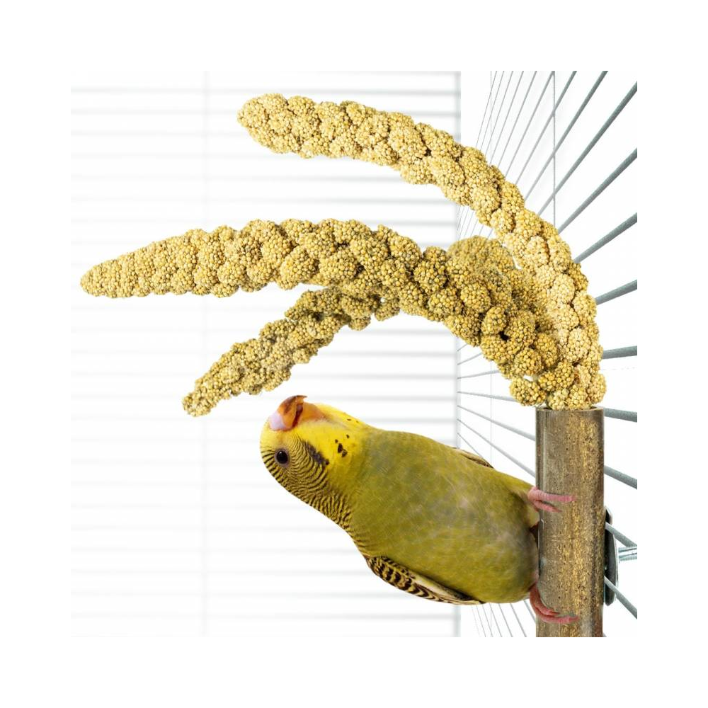 • Periquito verde e amarelo nas grades de uma gaiola branca junto a espigas de millet.
