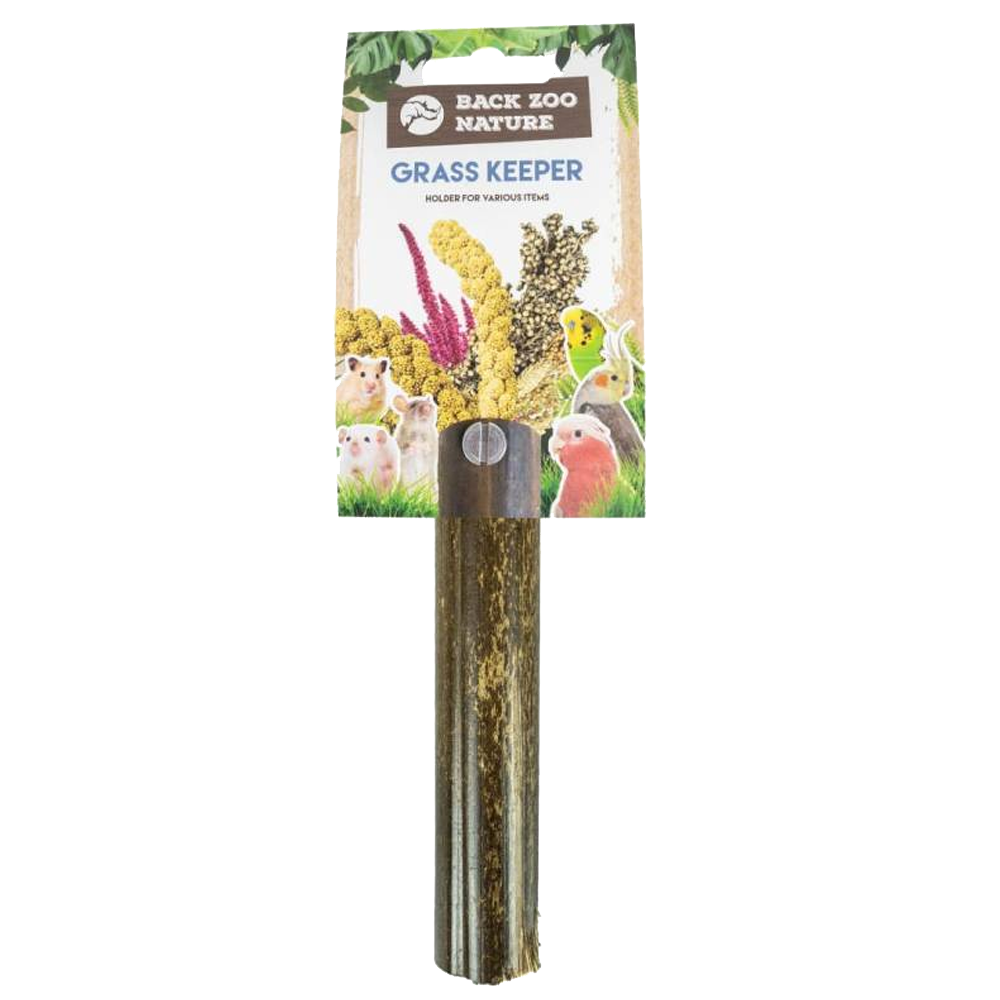 O Back Zoo Nature Grass Keeper é um suporte natural para spray de milho e outras espigas de sementes. O Back Zoo Nature Grass Keeper é feito de uma vara de bambu oca e preso a uma rosca de parafuso para que você possa prender o suporte a qualquer gabinete de treliça. Coloque o buquê de sementes preferido do seu bico torto neste suporte resistente para que não fiquem no fundo ou tenham que ficar presos entre as barras.