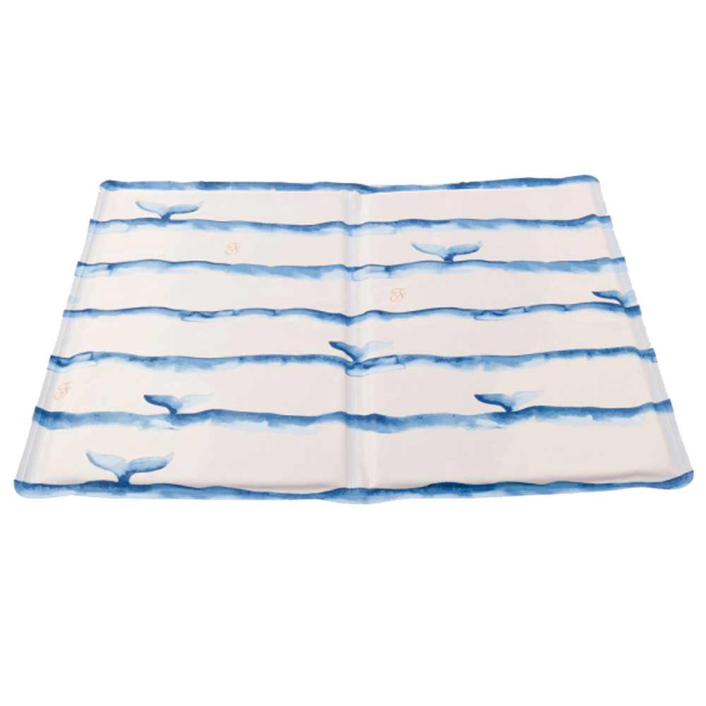 Tapete refrescante para cães, com dupla face: azul liso ou com padrão de baleias. Para manter os patudos frescos nos dias mais quentes!