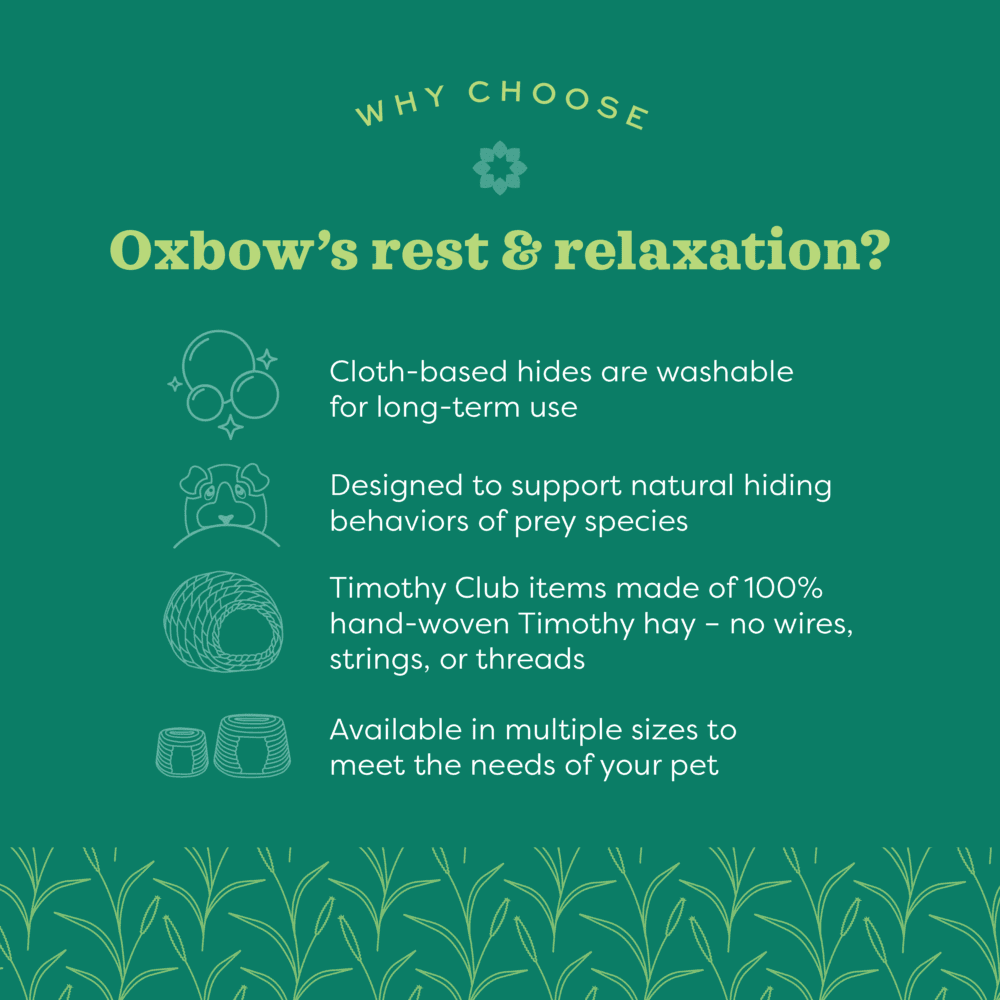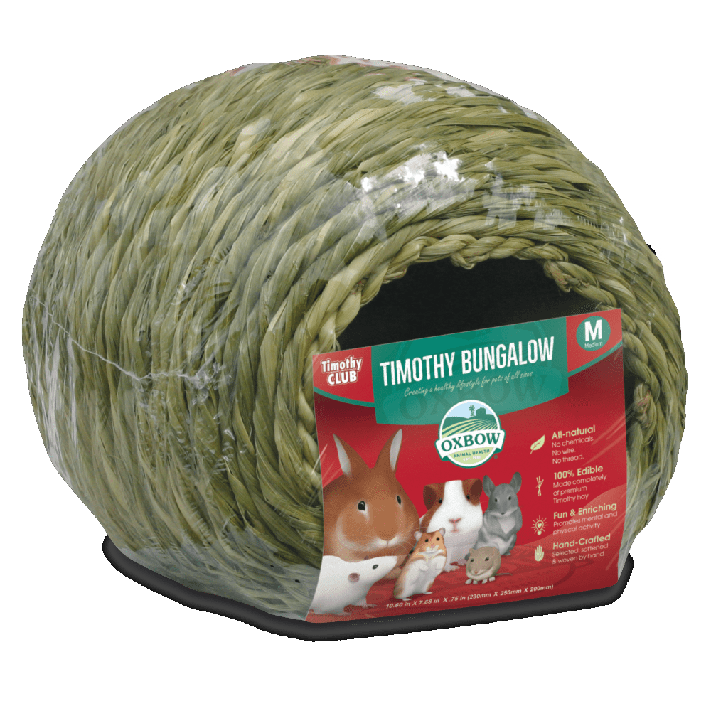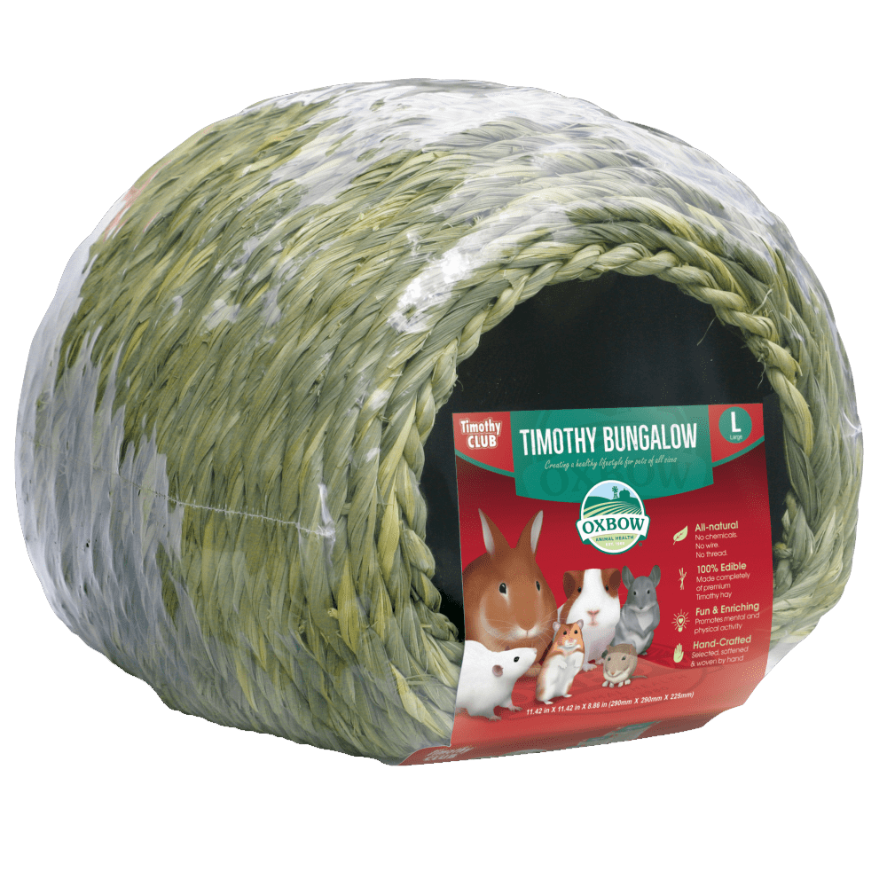 Um esconderijo comestível e enriquecedor para o seu pequeno animal de estimação. Todos os pequenos animais de estimação precisam de um lugar para relaxar e fugir do stress de ser uma espécie com predadores. O nosso bungalow Timothy CLUB oferece o lugar perfeito para seu coelho, porquinho-da-índia ou chinchila se esconder durante todo o dia, e ainda duplica como snack, já que é feito de 100% feno timóteo desidratado. Especies que não apreciem comer feno, podem ainda gostar de usar a toca para se esconder, e desgastar naturalmente os seus dentes. Cada Timothy CLUB é tecido à mão com nada além de feno Timóteo premium. 100% comestível, 100% divertido e enriquecedor.