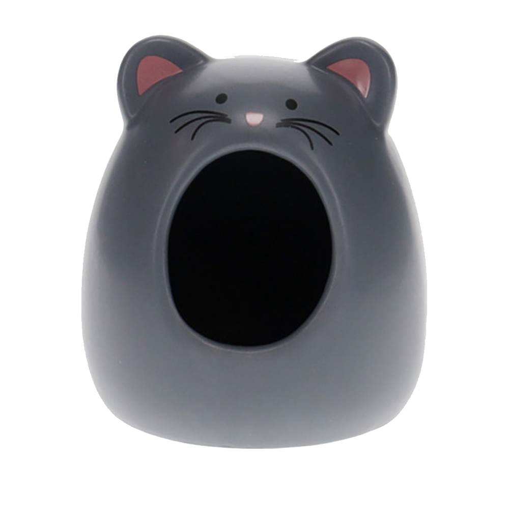 • Casa pequena para animais em forma de gato cinza com entrada oval preta
