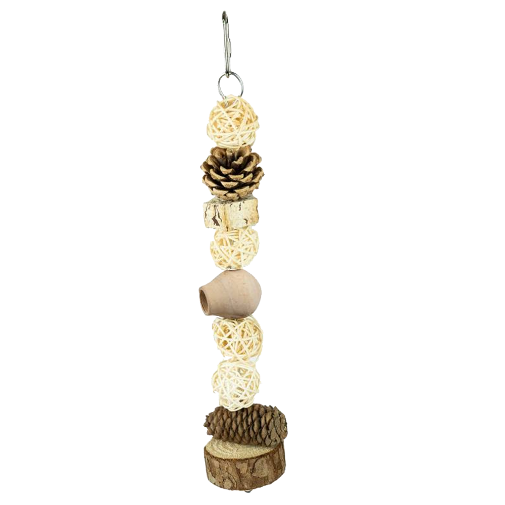 Esta torre está equipada com vários itens naturais como bolas de verga, pinhas, uma noz e um tronco de árvore. Os pássaros certamente se divertirão com isso de forma natural.