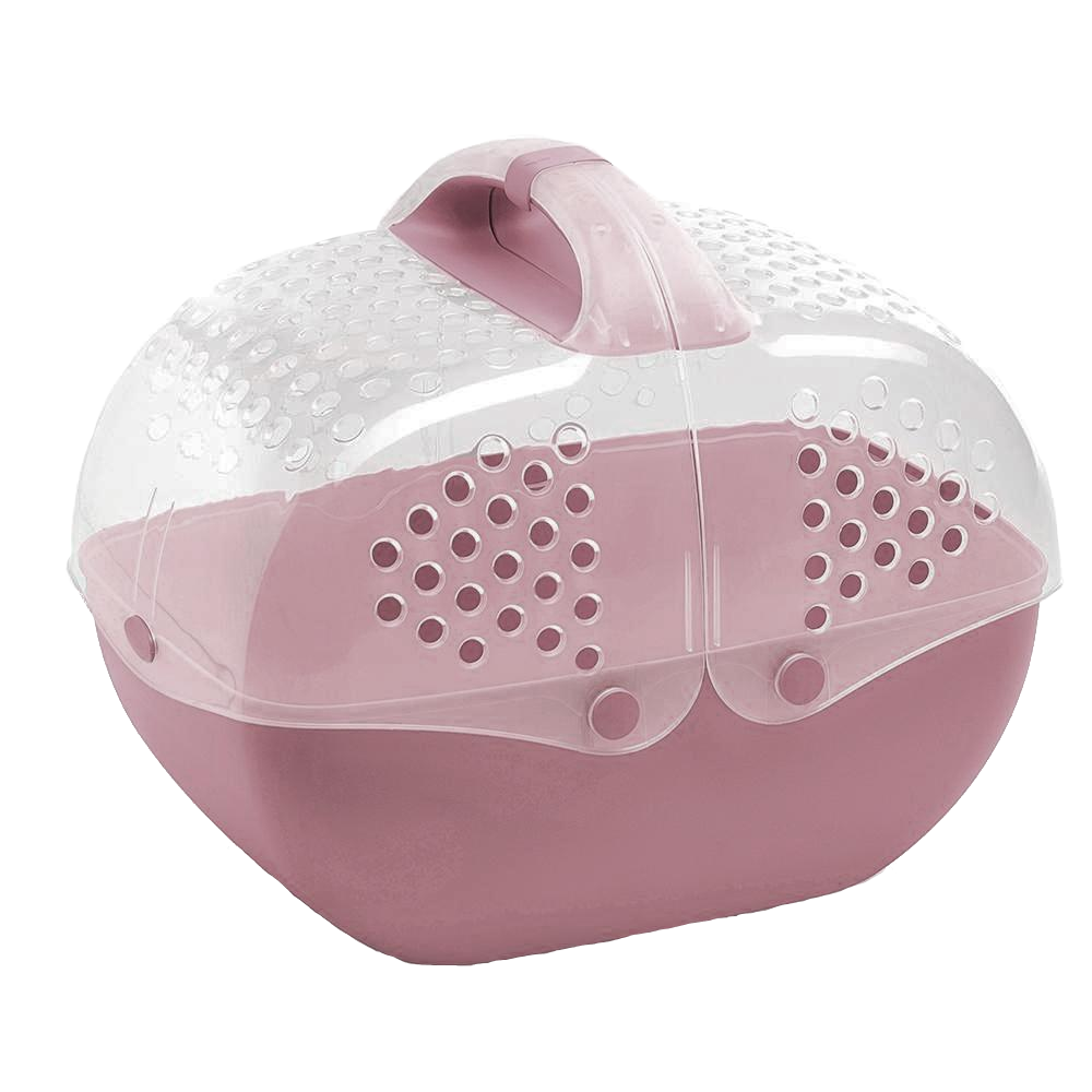 • Caixa transportadora de plástico rosa com tampa transparente e pega