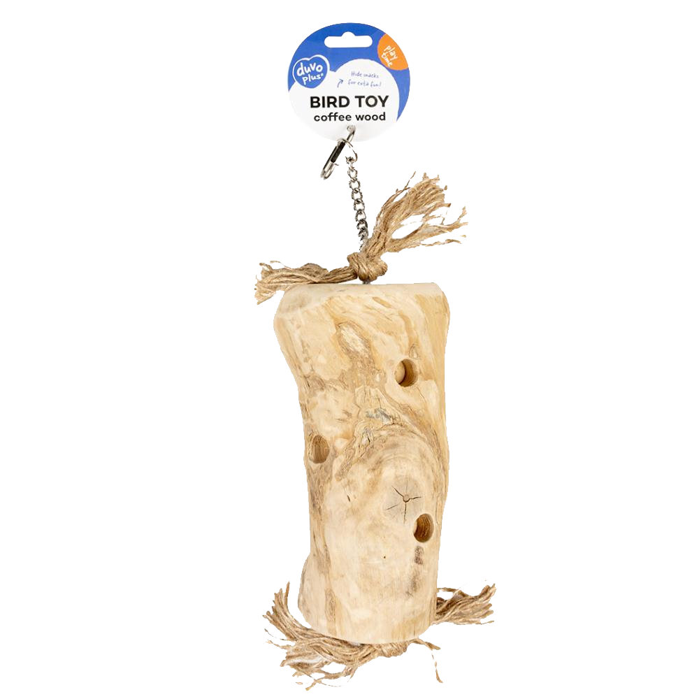 • Brinquedo para pássaros de madeira de café com cordas naturais e etiqueta azul e branca