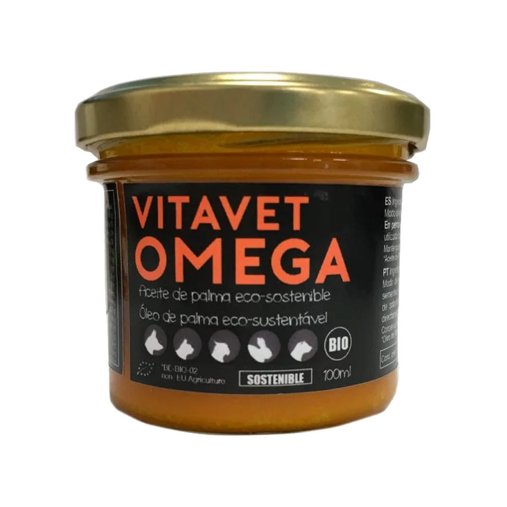 O óleo de palma vermelho, Vitavet Omega, é um suplemento natural proveniente agricultura biológica. É extraído da polpa de palmeiras cultivadas organicamente. Este suplemento é totalmente natural, possui nutrientes valiosos e um sabor delicioso para o seu animal de estimação. O óleo não é refinado, branqueado ou desodorizado, nem endurecido, direto da natureza para o frasco de vidro.